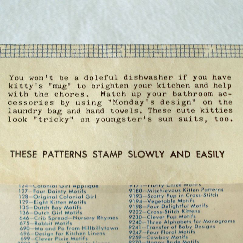 This 1950s packet of vintage Aunt Martha's Hot Iron stamped embroidery transfers is number 129 - Eight Kitten Motifs. The cute kitties are depicted in familiar days of the week chores and tasks for Days of the Week tea towels, with an extra design for a hot pad or pot holder. The pattern is complete, uncut, and unused (not sealed - the older ones were sold with the flap just tucked in).