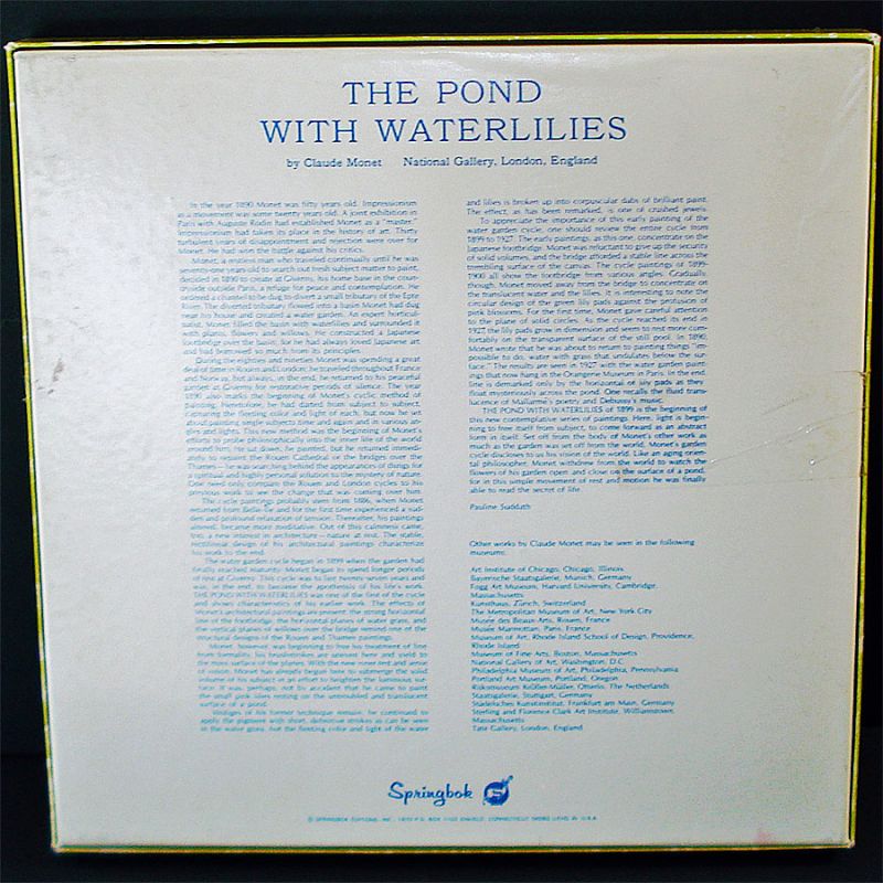 This 1970 original Springbok Editions (produced before Hallmark purchased the company) 500 piece jigsaw puzzle is part of a series depicting famous fine art museum paintings. It's titled Pond With Waterlilies. It depicts Claude Monet's circa 1899 impressionist painting of the water garden he designed on his property outside of Paris. The puzzle has been worked and is guaranteed complete. The old style, thick green-backed pieces fit perfectly and are in good condition. There's some clear tape across the box lid and some very light storage wear around the edges, otherwise the box is intact and in good condition.