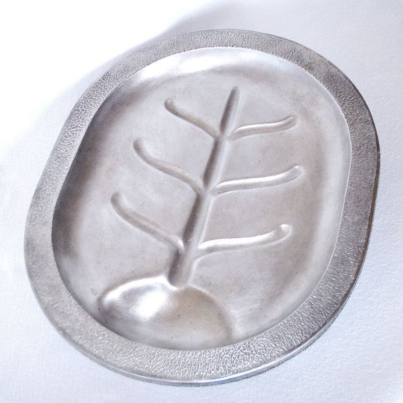 This attractive well-and-tree footed meat platter, however, did not survive the change over and was never made in the Guardian line. It measures 13-3/4 by 11 inches and rests on six molded feet. It's in excellent, shiny condition, with only minor, very shallow utensil scratches. Poor lighting on a sunless day caused the dark shadows in the pictures.