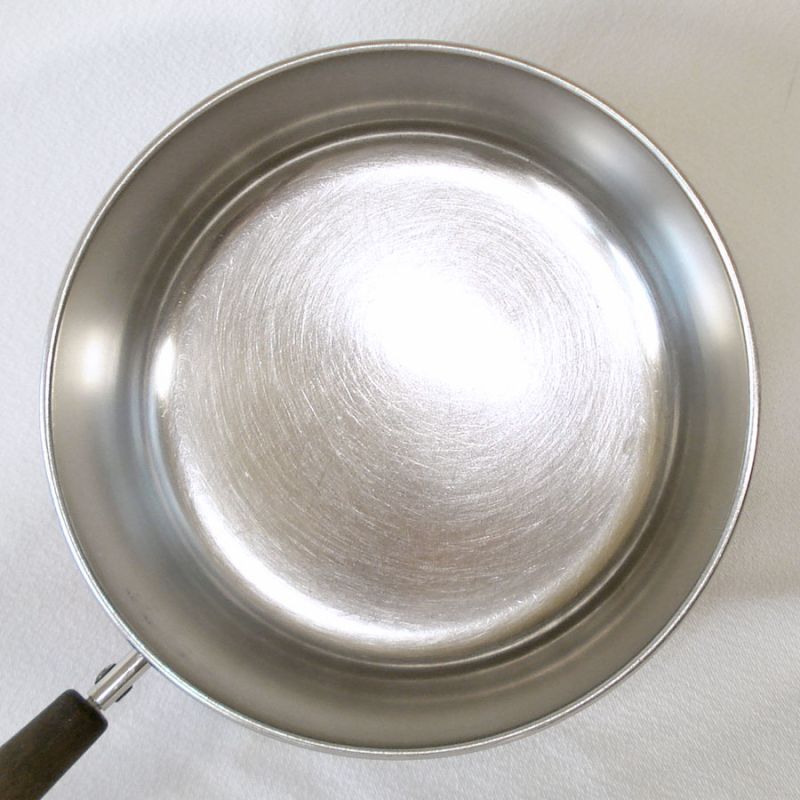 Vintage Revere Ware copper bottom stainless steel saucepan, 4-3/4 inches deep by 7-3/8 inches diameter. It holds 3 quarts to the rim. The stainless steel finish is shiny and clean with a few minor surface marks from cleaning and storage. The copper bottom has been polished. There's some color fading to the phenolic black handle and lid knob from dishwasher use but they're both sturdy and intact. The lid has more storage wear including a couple of shallow, faint dings. The mark on the bottom of the pan is faint but it was made in the Clinton Illinois plant between 1974 and 1977, based on the 1801 mark and lack of production date.