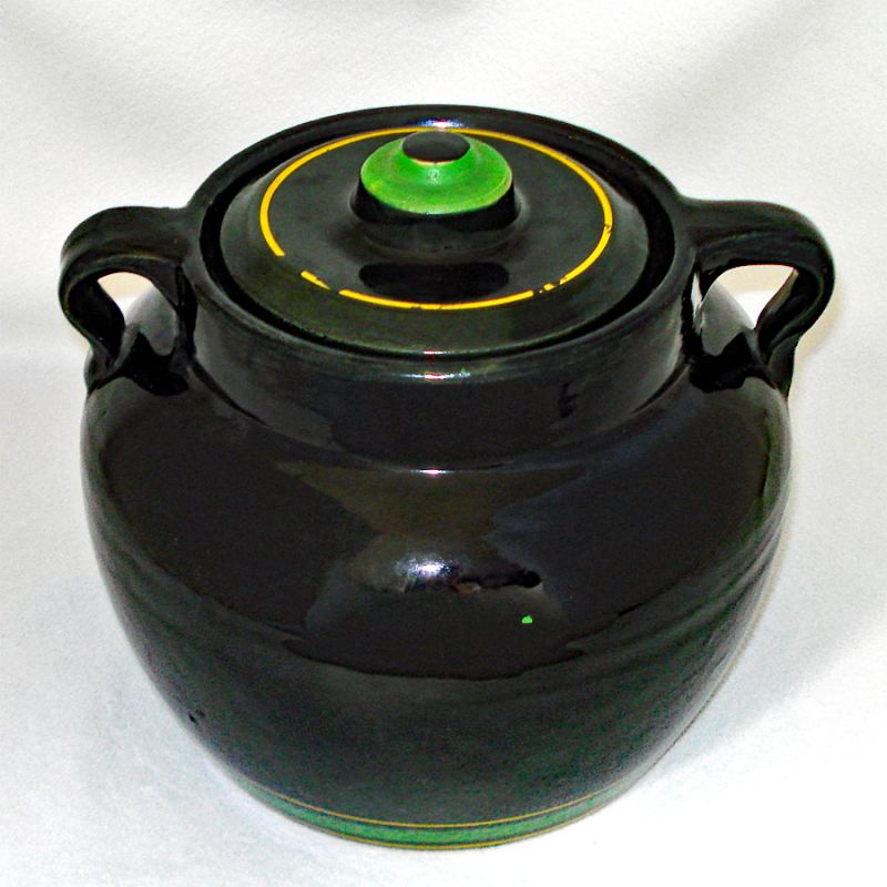 This one has a double handled bean pot shape with a fitted recessed lid and double handles at the shoulder. It's decorated with hand painted pink and flowers and green leaves on black. There are no chips, cracks, or flakes, just a little wear to the cold painted decoration, consistent with age. Measurements: 8" high, 9 inches wide across the handles. The jar is quite sturdy and heavy.