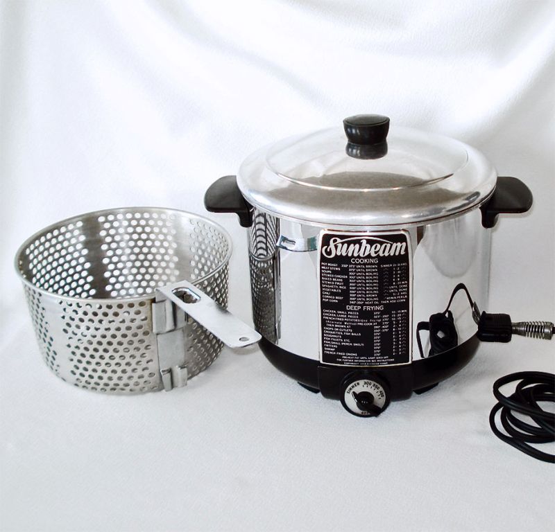 Highly collectible and very much usable original model CF Sunbeam chrome and black combination cooker and deep fryer, complete with original fryer basket, cord, and lid.