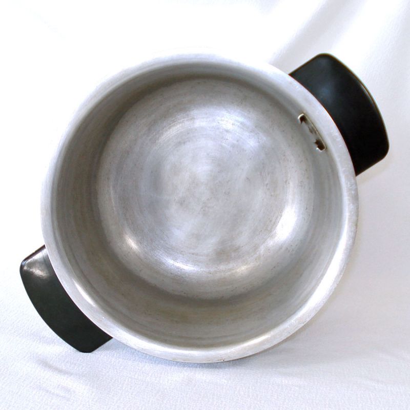 The appliance heats up fine and the so-very-retro white & black Bakelite arrow dial lights up when the cooker is plugged in. The metal plate with cooking and frying times and temperatures is dated 1952. The exterior chrome finish is clean and shiny though of course after more than 70 years of life there are a few slight storage or use scratches and polishing marks. The interior is also very clean with no kitchen residue or grease, though there is some minor speckling or heat marks as shown.
