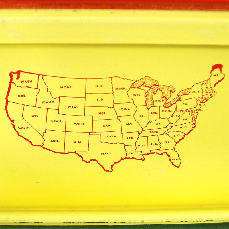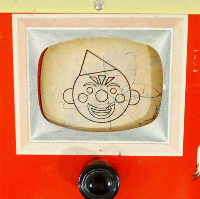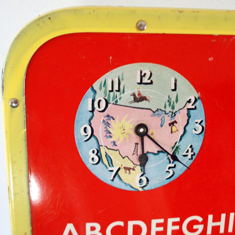 This Amsco Toys metal child's folding easel is from the 1950s. It's a little over 3 feet high and has a double-sided green chalkboard desk. The top has a clock, numbers, the alphabet, and a moving dial TV screen with clown images. The yellow panel in the middle has a chalk holder with the old 48-state USA map in the center. There are a few scuffs and scratches here and there, mostly to the legs. All but one of the hard rubber leg caps are missing, and the TV clowns have been drawn on. Otherwise, it's in very good vintage condition for a 70 year old child's toy.