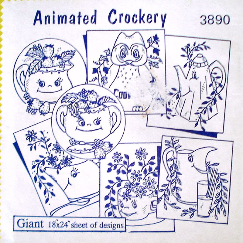 Two never used, sealed 1960s hot iron transfer pattern packets for embroidery, painting, or crafts from Aunt Martha's Colonial Patterns. The first is number 3890, Animated Crockery - a giant 18 by 24 inch sheet of anthropomorphic dishes, cookie jars, teapots, etc. The other packet is number 3632, Fruits and Vegetables. The designs are suitable for kitchen dish or tea towels, placemats, pot holders, aprons, curtains, etc. If purchasing more than one transfer pattern packet, I'll refund any excess postage.