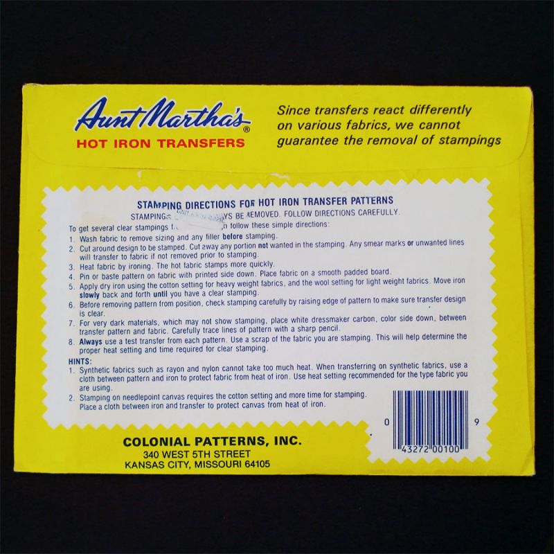 This Mid Century sealed pack of Aunt Martha's hot iron transfer patterns for days of the week kitchen towels is number 3419, Cross Stitch Colonial Girl. Only five are shown on the packet, but there will be at least seven different scenes depicting a Sunbonnet Sue or Sunbonnet Baby style little girl doing her daily chores. If purchasing more than one transfer pattern packet, I'll refund any excess postage.