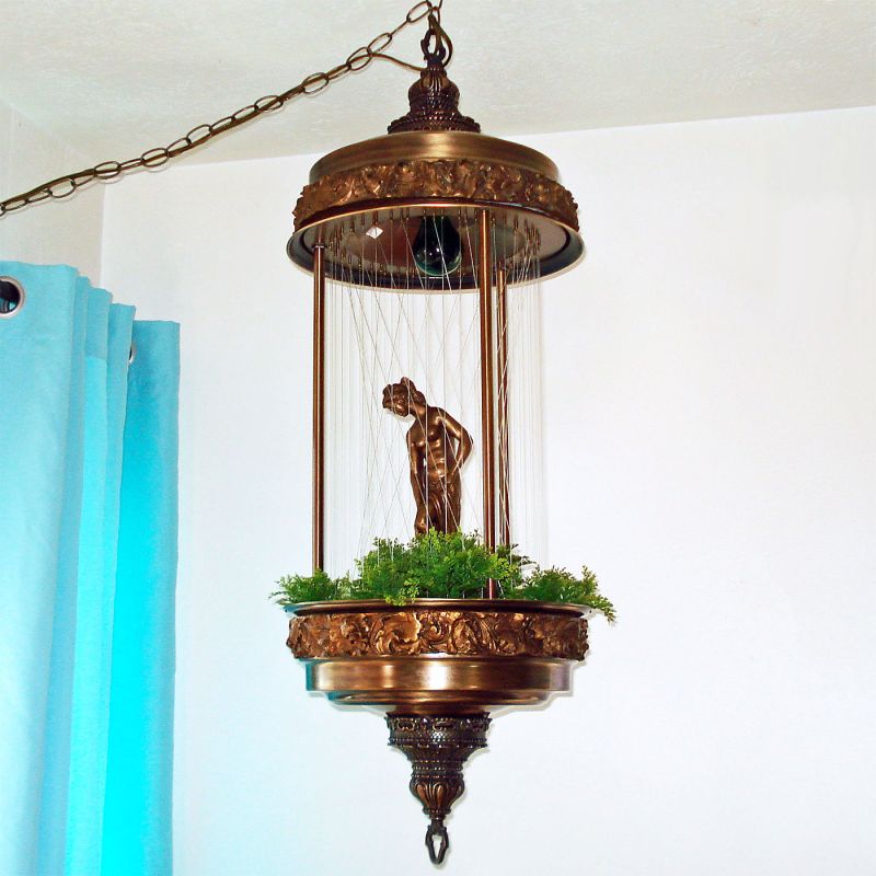This iconic hippie era swag lamp was made by Johnson Industries, the original inventor. They called it a Rainlamp due to the use of mineral oil dripping down the diagonal monofilament strings to simulate falling rain. This is the model 880 in "weathered brass", shown on the cover of Johnson's 1970s Rainlamps catalog.