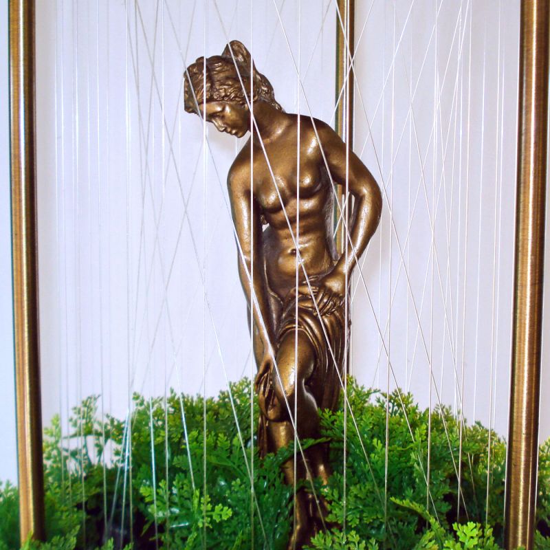 The lamp is about 38 inches high by 14" diameter. The center Venus or goddess figure in the center is surrounded by artificial plastic fern greenery. It comes with a working green light bulb. The original UL and Johnson labels are still attached to the interior roof, included one listing the serial number.