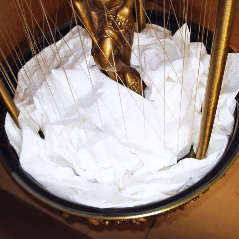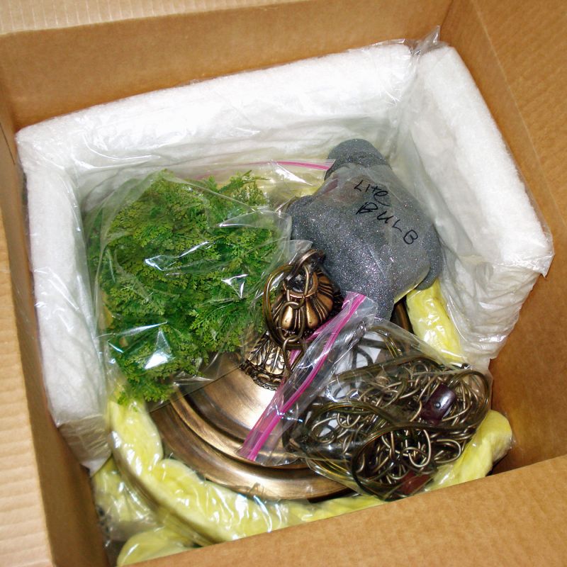If I were thinking about purchasing this lamp, I'd be very concerned about shipping damage. So I've added several photos showing how I packed it up: lining the bottom with lots of paper towels in case of any residual oil, wrapping the entire lamp in layers of blank white newsprint, then wrapping in big sheets of plastic encased thick padding. The ferns, light bulb (encased in foam), and chained cord are at the top, over which more thick padding is placed. Nothing in the box can move, so I'm confident it will arrive safely unless it falls out of an airplane.