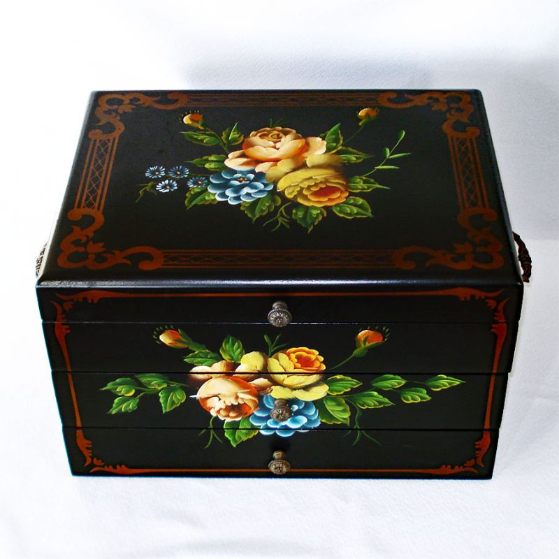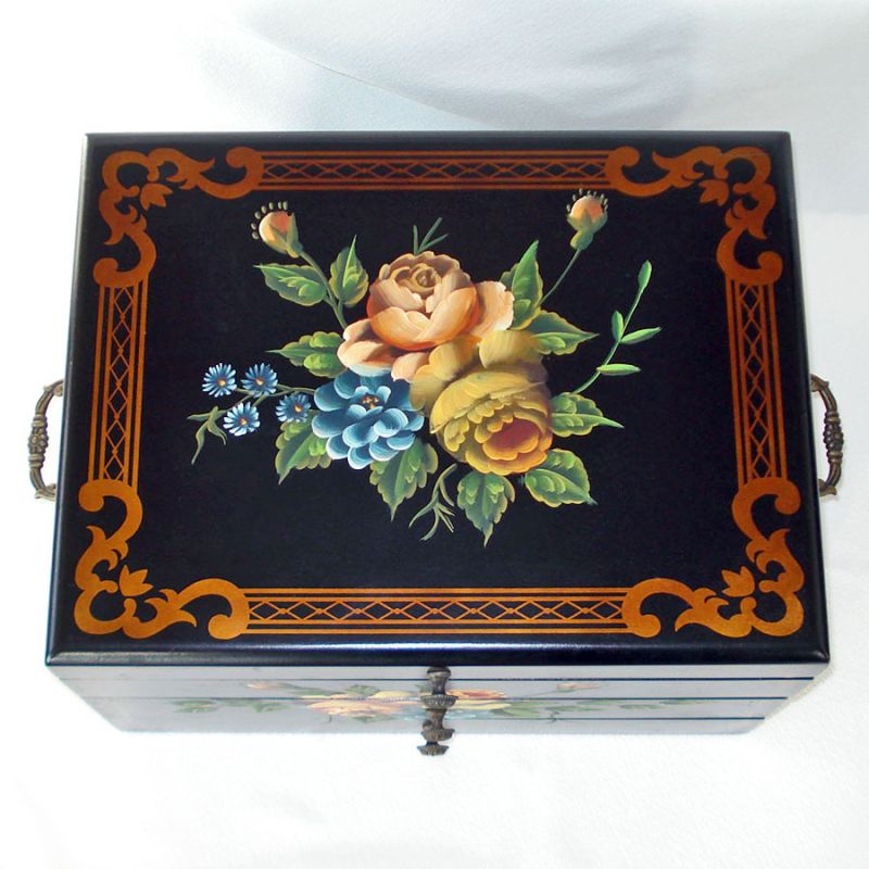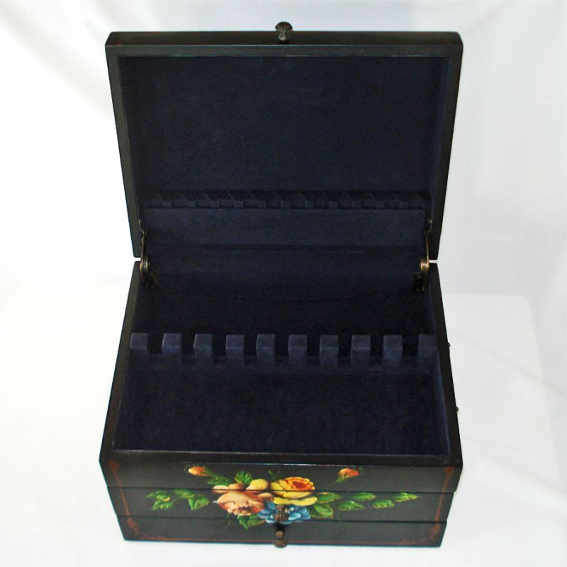 This large, roomy wooden flatware chest is decorated on the top, sides, and front with hand painted flowers on black. It has three levels, cast brass side handles and drawer pulls, and is lined in blue-black anti-tarnish flannel. The chest is about 15 by 11 by 9-1/2 inches high and quite heavy - it's not a cheap, flimsy piece. It will hold service for 12 (at least) and many serving pieces, napkin rings, etc. It has no markings as to maker or origin but looks like it was used very little if at all. The paint and finish are intact and the interior is clean other than a few random specks of dust from storage.