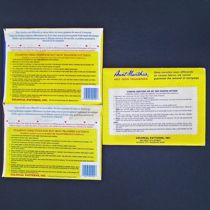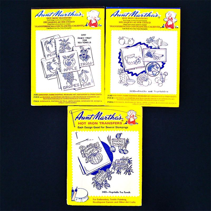 Three Aunt Martha's unused, sealed hot iron transfer pattern packets for embroidery or crafts. All feature different fruits and vegetable themes for tea towels, kitchen curtains, pot holders, or wall hangings: