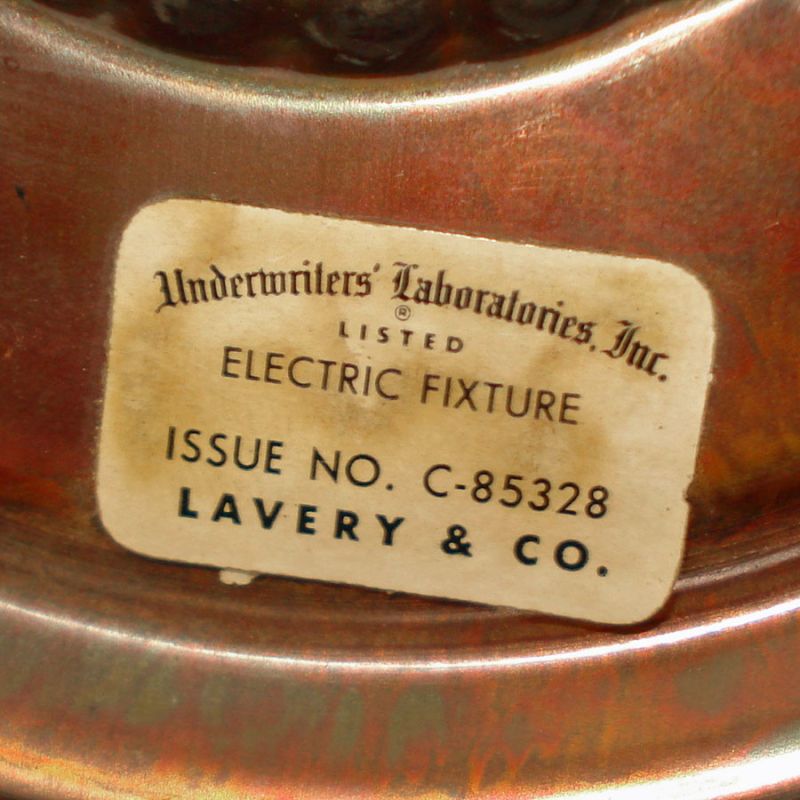 This Lavery & Company Early American style electric ceiling lamp fixture is from the 1950s to early 1960s. It's a smaller sized light, probably designed to hang over a kitchen sink, island, or breakfast bar. It features a ruffled milk glass hobnail shade with copper plated fixture, chain, and hardware. It's about 14 inches high from the ceiling cap to the bottom finial by 8-1/4" diameter. The shade is 7 by 11 inches and has no chips or damage. The old cloth-covered socket wiring is disintegrating and needs to be replaced. See my other listings for a matching larger hanging lamp and a pair of wall sconces in the same copper and white hobnail theme.
