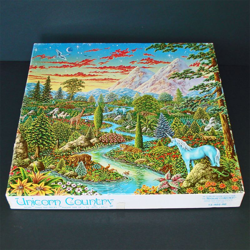 This colorful 1982 Eaton jigsaw puzzle features an elaborately detailed fantasy scene of a unicorn in the wild with many other animals, reproduced from an original painting by Michael Fishel. Assembled size is 18 by 24 inches, over 500 pieces. The puzzle has been worked and is guaranteed complete.