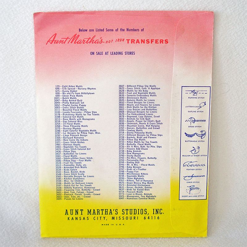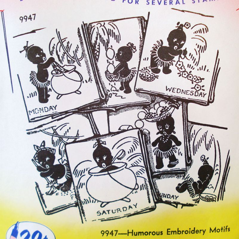 This 1960s packet of Aunt Martha's hot iron transfers features seven designs depicting African babies in the jungle. This set was originally titled Humorous Cannibal Motifs. Apparently along the way someone pointed out the term is offensive, so they changed it to Humorous Embroidery Motifs on the front, but left the original title on the pattern listings at the back of the envelope. Then more recently the name was changed to Tropical Babies.