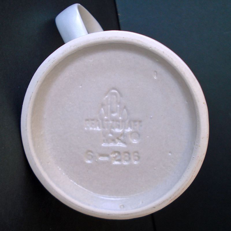 This American made stoneware beer stein or mug is the Yorktowne pattern by Pfaltzgraff. It's decorated with a blue on light gray patriotic eagle emblem. The mug holds 16 ounces and is a little over 5-1/2" high. In excellent condition with no wear or damage.