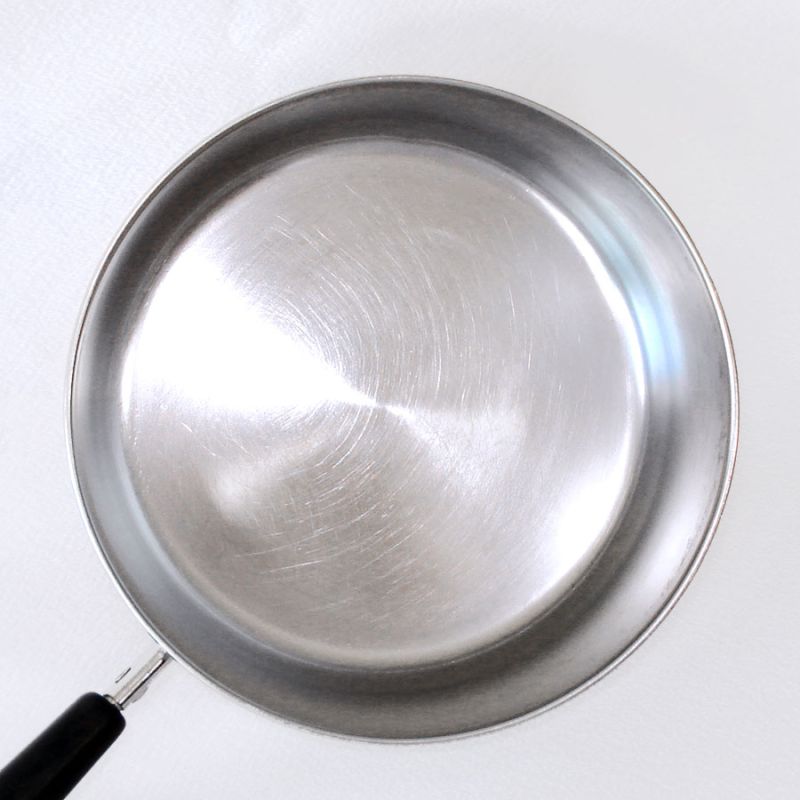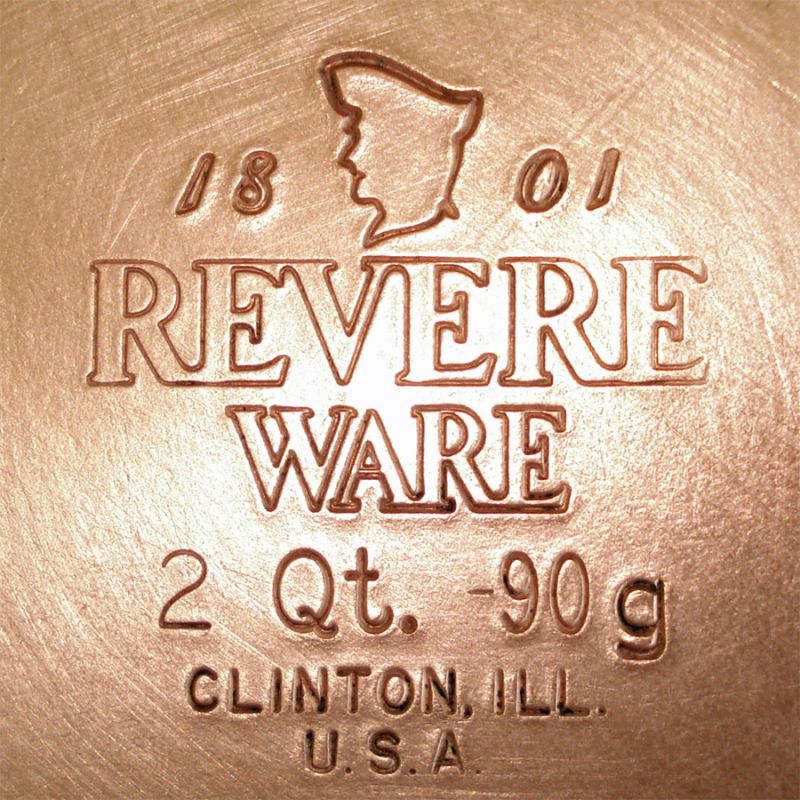 A two quart Mid Century saucepan with lid in sturdy stainless steel with copper bottom by Revere Ware. It measures 7-1/4" diameter by 3-1/2 inches deep. It's clean and shiny with a freshly polished copper bottom and it sits perfectly flat with no rocking. As with any vintage stainless steel cookware pot, there are of course a few hair-fine stirring and storage marks, very minimal. The USA made saucepan was made in 1990 at the Clinton Illinois Revere plant.
